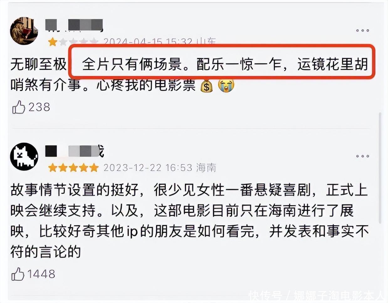 这句话引起争议后,网友爆出在首映前就有一条豆瓣影评提到:“全片只须俩场景,配乐一惊一乍,运镜花里胡梢,煞有介事。”